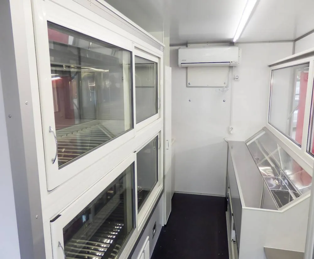 Внутренние размеры фургона 4700х2080х2030 мм или могут быть увеличены. Передвижной магазин представляет собой шасси с автолавкой, которая включает в себя удобный холодильный шкаф с витриной и гардеробный шкаф с дверью. В ДЖАК 80 предусмотрено автономное водоснабжение.